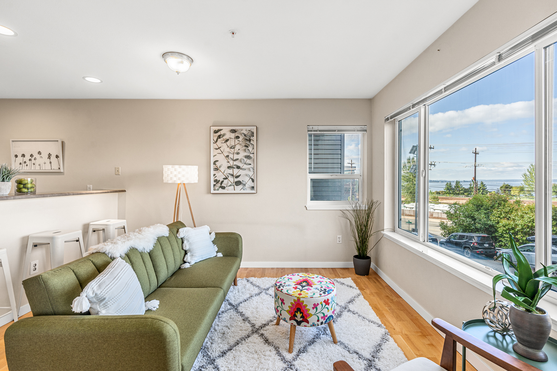 Well-maintained and updated Lower Queen Anne 2-bedroom condo with Elliott Bay and Olympic Mountain views. Private balcony overlooking Myrtle Edwards Park. Bright, open floor plan with dining bar, hardwood flooring throughout and in-unit washer/dryer. Secure garage parking space and storage unit. Pet friendly building. Low HOA dues. Investor alert, NO rental cap! Walk Score 85, just steps from transit, bike trails and across the street from Expedia’s new campus. Excellent investment or pied-à-terre.